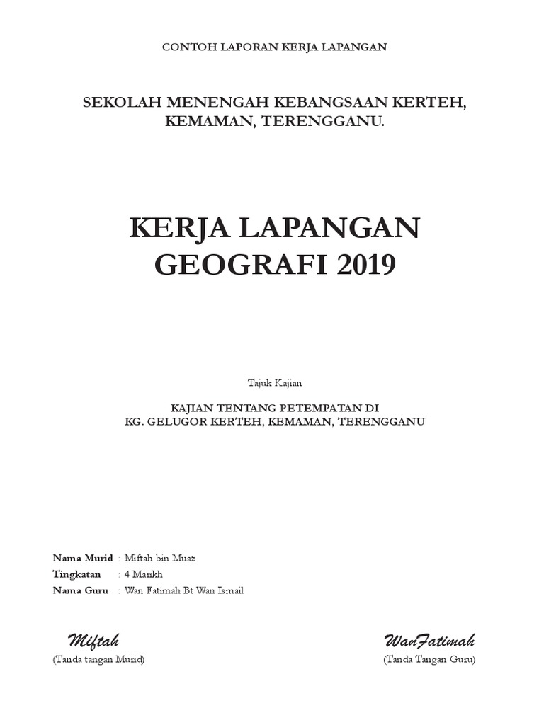 Berikut adalah format asas yang perlu ada dalam penulisan laporan kerja kursus kajian lapangan geografi pt3 klgt3. Seterusnya sekalung penghargaan kepada guru geografi cikgu fasila abdul rahman. Berikan penghargaan yang tulus terhadap peringkat kelas.